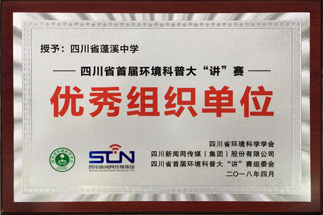日,在第49个地球日到来之际,以“美丽中国我是行动者”为主题,纪念“422地球日”活动暨四川省首届环境科普大“讲”赛颁奖典礼在成都市海滨小学学术报告厅隆重举行,我校学子获得2个二等奖,3个三等奖。在全省参赛学校中,我校获奖项目最多,并获得“优秀组织单位”和“四川绿色小记者传播基地”荣誉称号。