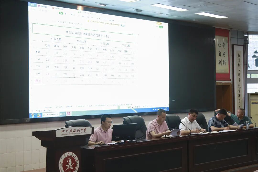 会议伊始,教务处副主任唐鑫对高三年级“遂宁三诊”考试成绩进行了细致详尽地分析,他从“零诊”、“一诊”、“二诊”、“三诊”四次考试的各班各科成绩、平均分、市排名等各项数据作横向纵向对比,剖析问题。从与市内其它兄弟学校比较的优生分数、学科平均分数、优生人数、各班成绩及重本、本科预测人数、我校重本、本科预测人数等方面进行了分析,肯定了老师们的付出和取得的成绩,希望全体老师在各项数据的对比中寻找差距与不足,笃实前行,锁定奋斗目标,全力以赴。