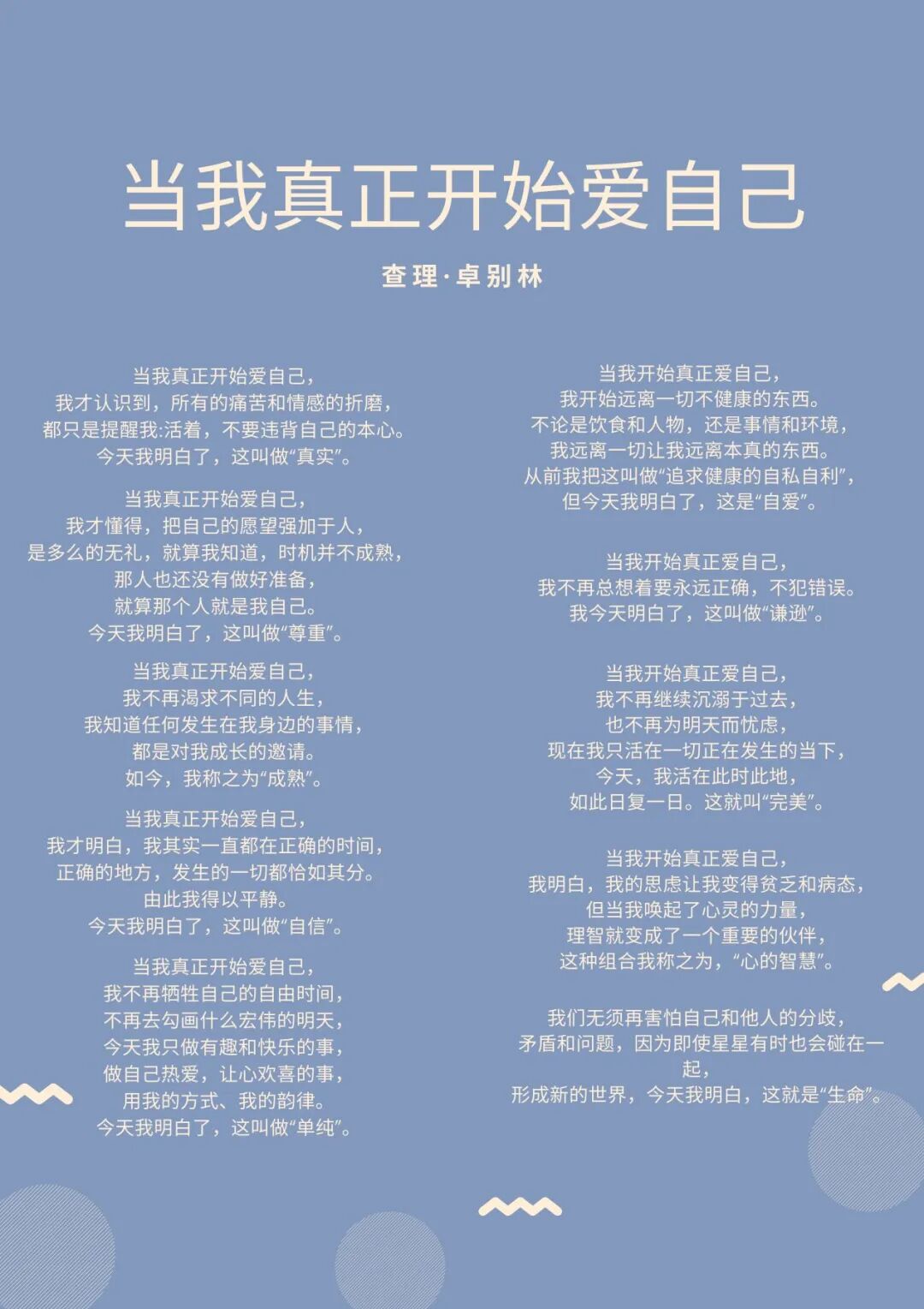 这首诗歌充满了深刻的思考和哲理,其内容涵盖了人类的各个方面,包括精神、情感、身体以及心灵等。爱自己是每个人的必修课题,希望正在阅读文章的你可以更了解和认识自己,同时也能够找到更好的方式来面对挑战和改进自己。