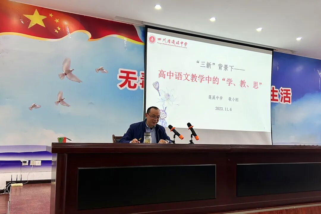 最后,高二语文备课组长敬小刚老师带来了题为《“三新”背景下——高中语文教学中的“学、教、思”》的专题讲座。敬老师首先提出了新高考、新课标、新教材背景下,当前教学存在的现实问题:第一,新课标指导下如何实施群文教学和单篇教学;第二,新课标指导下如何实施任务群教学和主题教学;第三,新课标指导新课改背景下如何实施整本书阅读;第四,语文核心素养培养与课程结构化。随后,提出三个相关解决策略,助理课程教学改革,促进高中语文教学实现新突破。一、锚定新高考,营造课程育人新氛围。作为一线教师,我们一定要清醒地认识到高中语文新旧教材、新旧课标、新旧高考之间的变与不变,在变中求突破,在不变当中谋发展。根据政策动向,适时调整我们的课堂教学,特别是要把新高考对语文教学的新要求贯穿到日常教育教学的全过程。二、研读新课标,创设情境提升思辨力。新课标要求,“根据学生的发展需求,围绕学习任务群创设能够引导学生广泛、深度参与的学习情境。”这就要求我们教师要因势利导,在摸清学情的基础上,分别从“个人体验”“学科认识”“社会生活”三个不同维度,积极创设利于学生接受的学习情境。三、活用新教材,构建大单元教学新体系。在日常教学中,我们要大胆取舍,把握好“双线结构”,创新教材体系设计,充分利用好“单元导语”“学习提示”“单元学习任务”等教材栏目,按照课标中对学习任务群的要求,合理选取学习内容,精准定位学习目标,重视单元目标与学习实践活动的结合,以大单元学习任务为引领,整合教材文本资源,从阅读表达、人文素养、综合实践等多维度、多视角切入,以大单元教学新体系凝聚教学合力,促使语文核心素养全面落地开花。