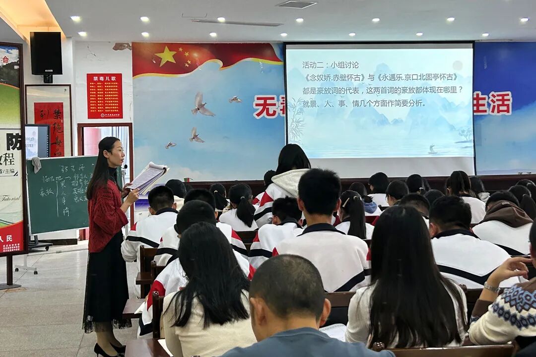 蓬溪中学高一年级陈雪老师首先为大家带来了一堂别开生面的公开示范课。以“生命的诗意”为题,将部编版必修上第三单元第九课的《念奴娇·赤壁怀古》和《永遇乐·京口北固亭怀古》两首词进行对比阅读,立足学情,思路清晰。在教学设计上,取“怀古”共性,引导学生从“意象、典故、情感、作者形象”的角度进行对比阅读,分析两首词所具备的不同特点,进而引导学生总结怀古词的基本情感模式“怀古伤今/己,借古讽今”和用典的基本表达效果“含蓄深沉,意蕴无穷”。在用典分析的基础上,根据学生特点,再次进行思维提升,引导学生分析用典中的英雄形象描写,让学生结合课前人物生平了解在知人论世的基础上以典读人,感受宋代两大豪放派代表作家苏轼和辛弃疾不同的豪放特征——“旷”与“豪”。诗词是一个广阔的世界,读诗不仅仅是为了让学生读词句、知方法,更是希望学生从诗词中体悟一种精神力量,在面对人生风雨时既能用英雄的豪气与命运相抗,也能用旷达和释然与生活和解。课堂通过多次小组合作探究,真正做到了以学生为本,发挥学生的主动性。陈老师与学生互动频频,语言简洁,循循善诱,充分调动了学生参与课堂的积极性,给我们展示了一个充满活力又高效的课堂。