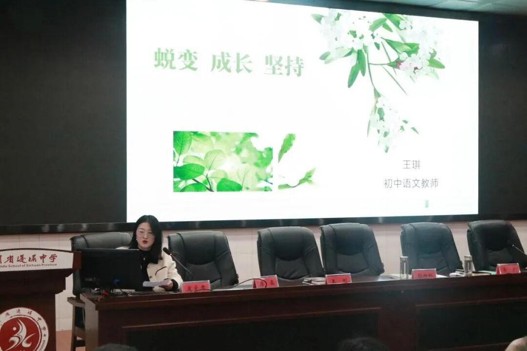 成长之星获得者王琪老师以《蜕变·成长·坚持》为主题进行分享,通过三个关键词阐述这一年来的成长感悟,以图片的形式展示成长的足迹,表明自己成为一名优秀教师的坚定决心。