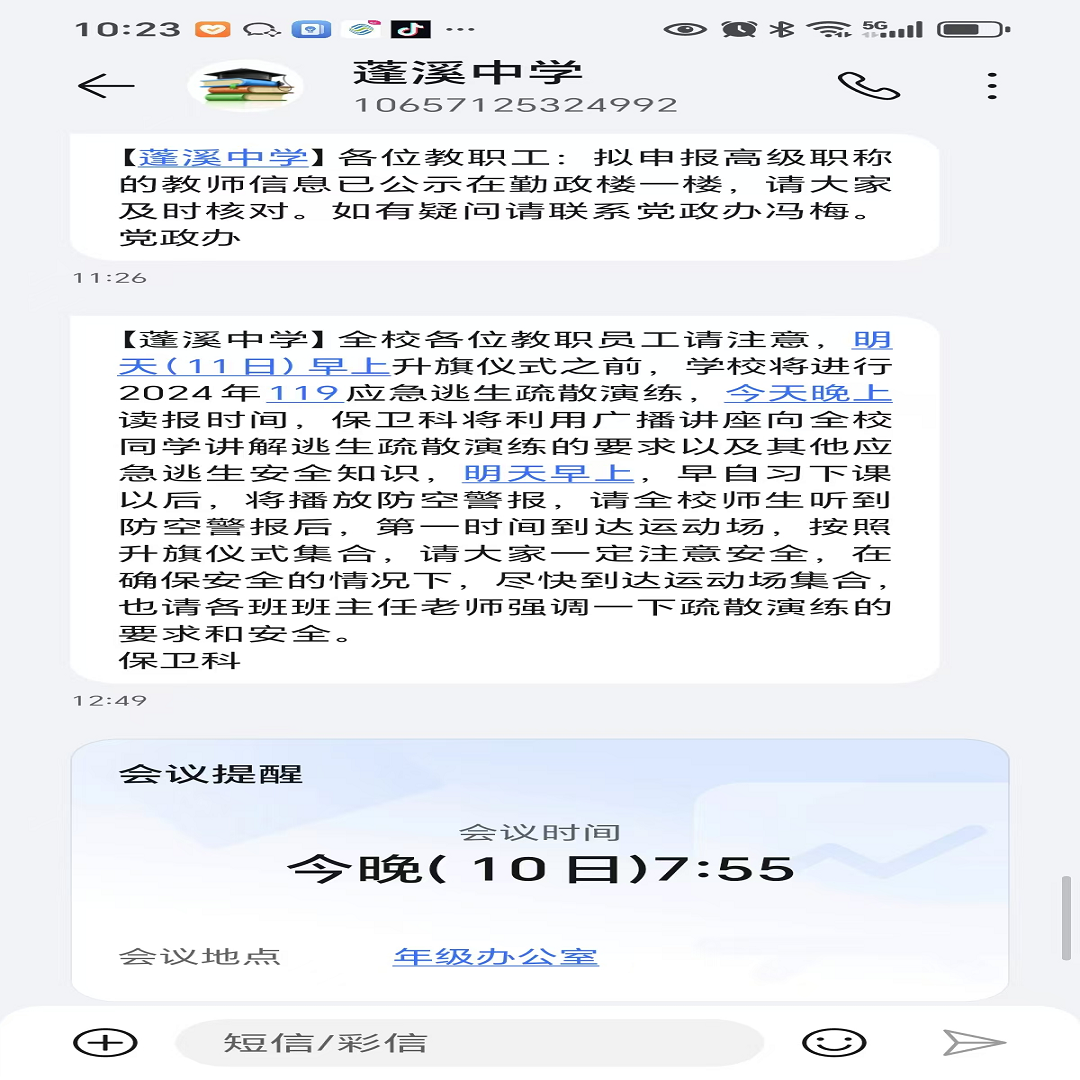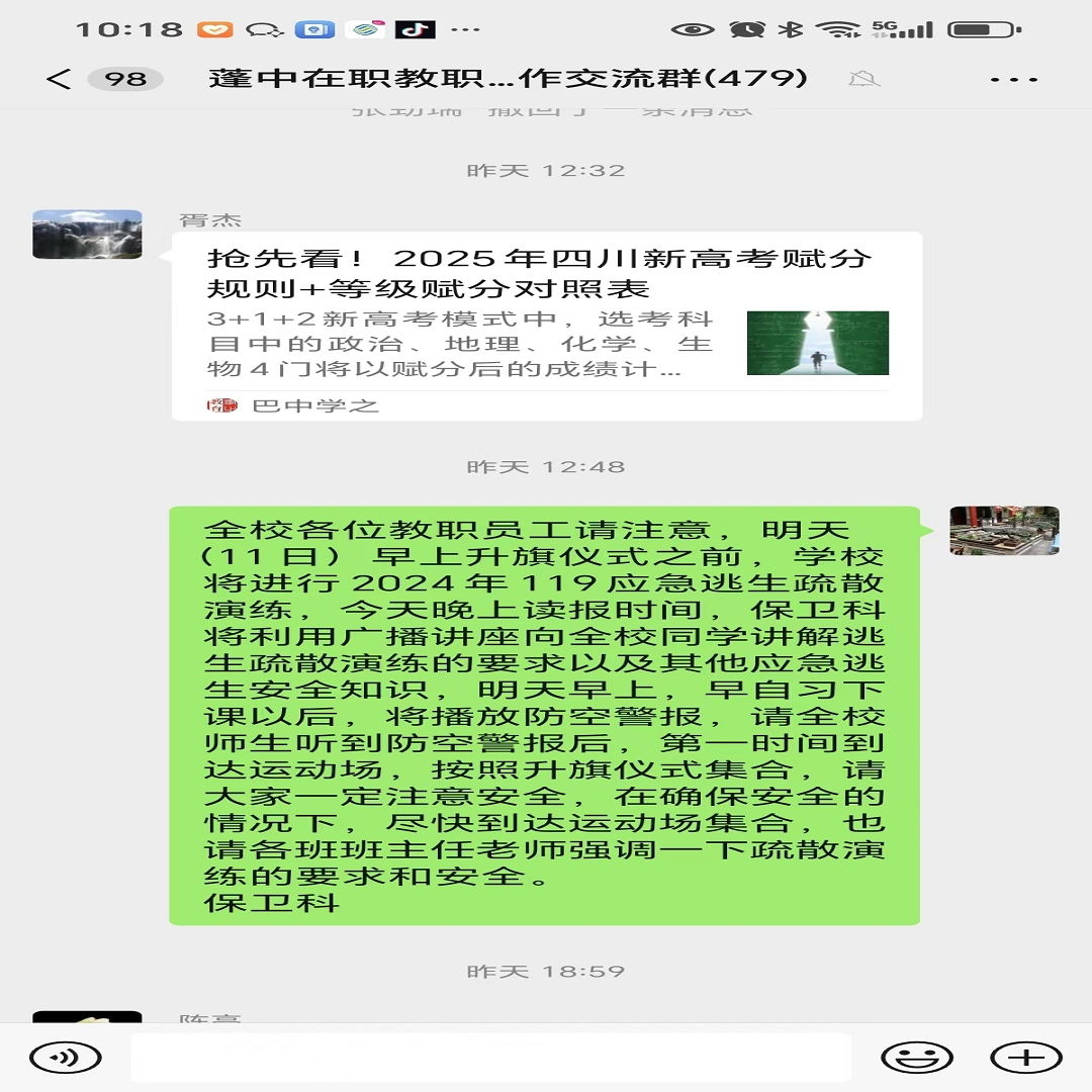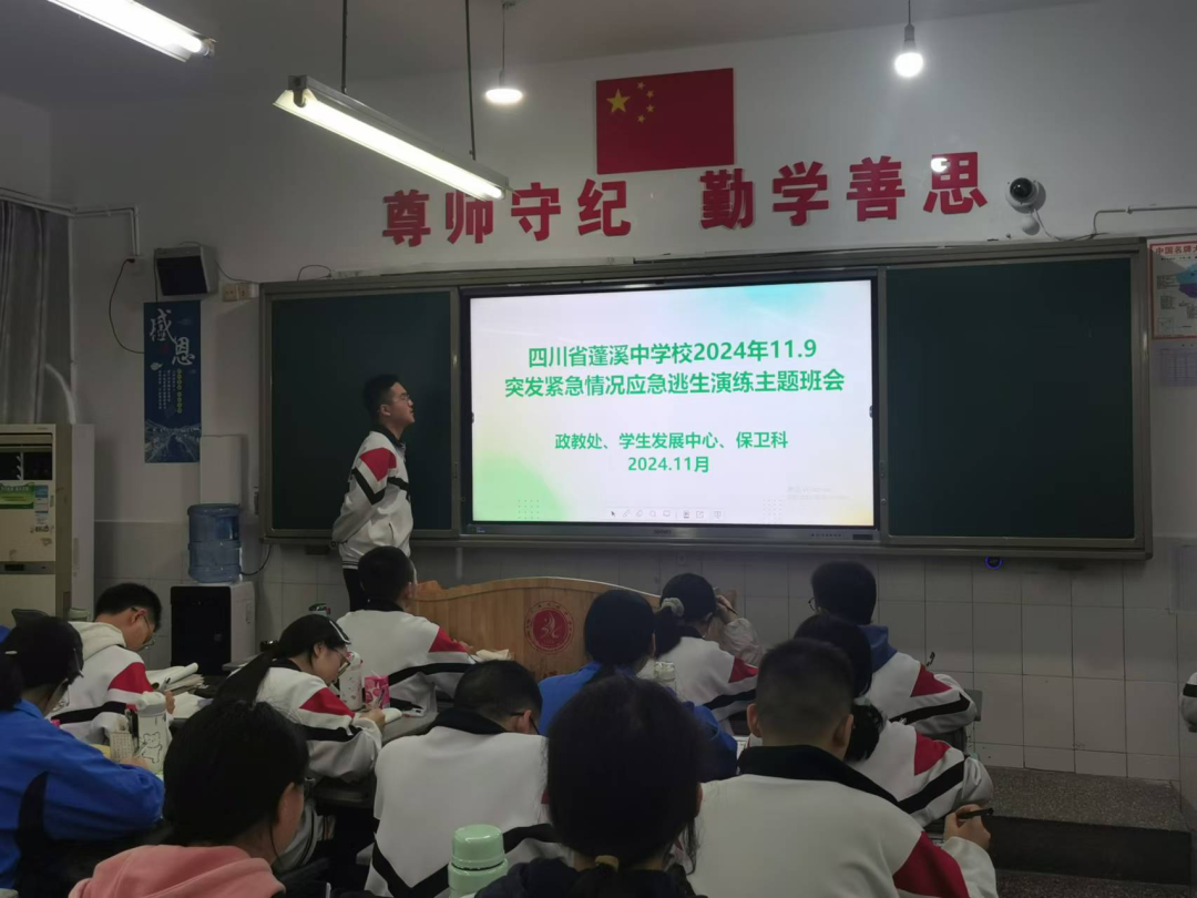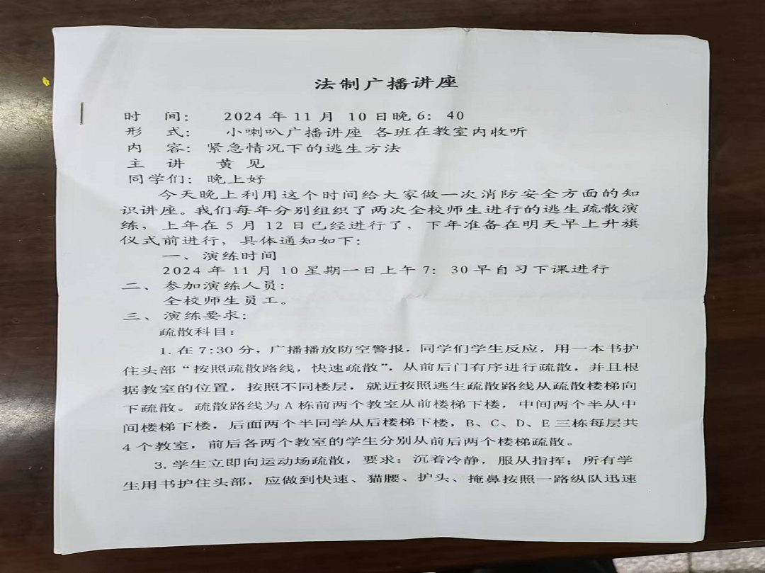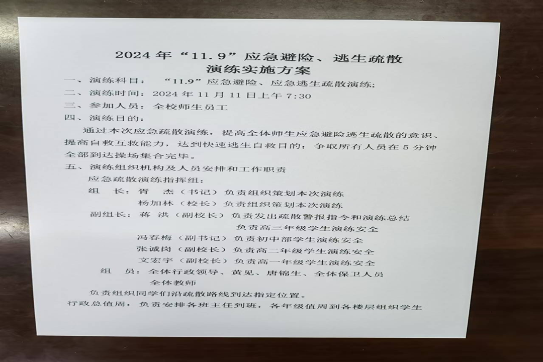 为提高我校师生在紧急情况下应对突发事件的能力,提高师生应急、避险、逃生疏散的意识,提高师生自救、互救能力,我校在11月进行了2024年下期紧急情况下应急逃生疏散系列活动。11月初,学校专门召开活动工作专题会,研究部署相关事宜,提出了活动的要求,制订完善了活动方案。并通过短消息、微信通知、广播讲座的形式将活动的目的、意义等传达到每一位师生,让每一位师生了解了活动的的流程,确保系列活动的顺利进行。安排部署专题会