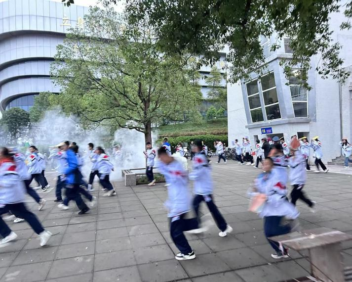 在11月11日上午7:30分,广播响起防空警报声音,同学们快速起身,头顶课本,按照疏散演练路线,有序的跑出教室,跑下教学楼,跑向空旷的运动场,所有师生全部跑出教学楼,用时3分01秒。 同学们有序疏散