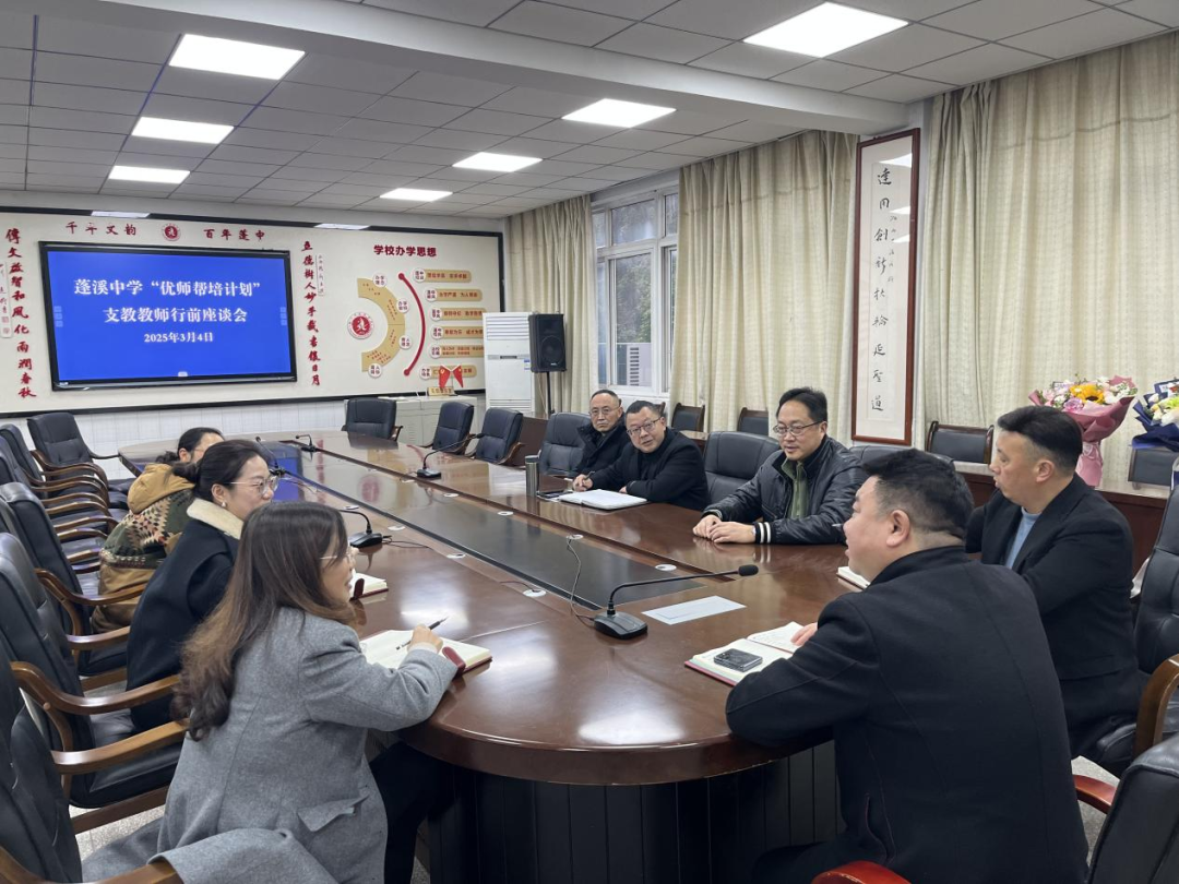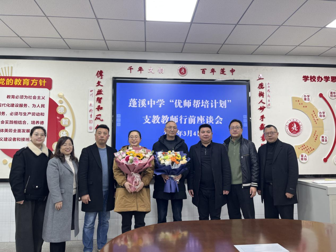 3月4日,蓬溪中学举行“优师帮培”计划支教教师行前座谈会,为即将奔赴支教岗位的两名优秀高中教师送行。全体校级领导参加会议。