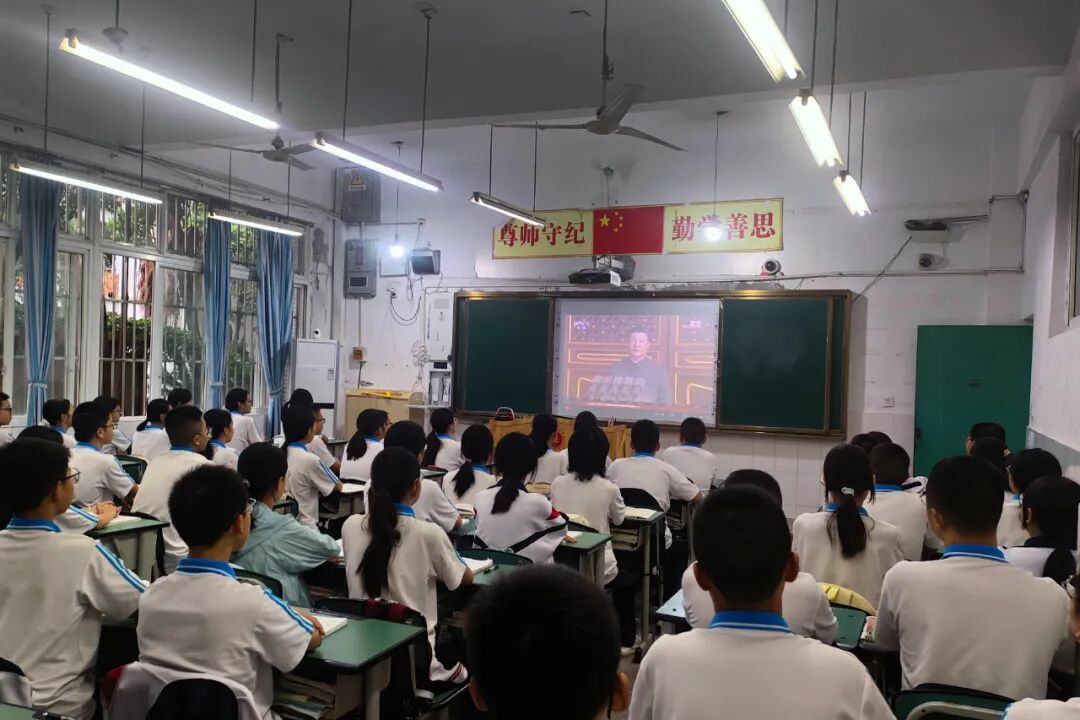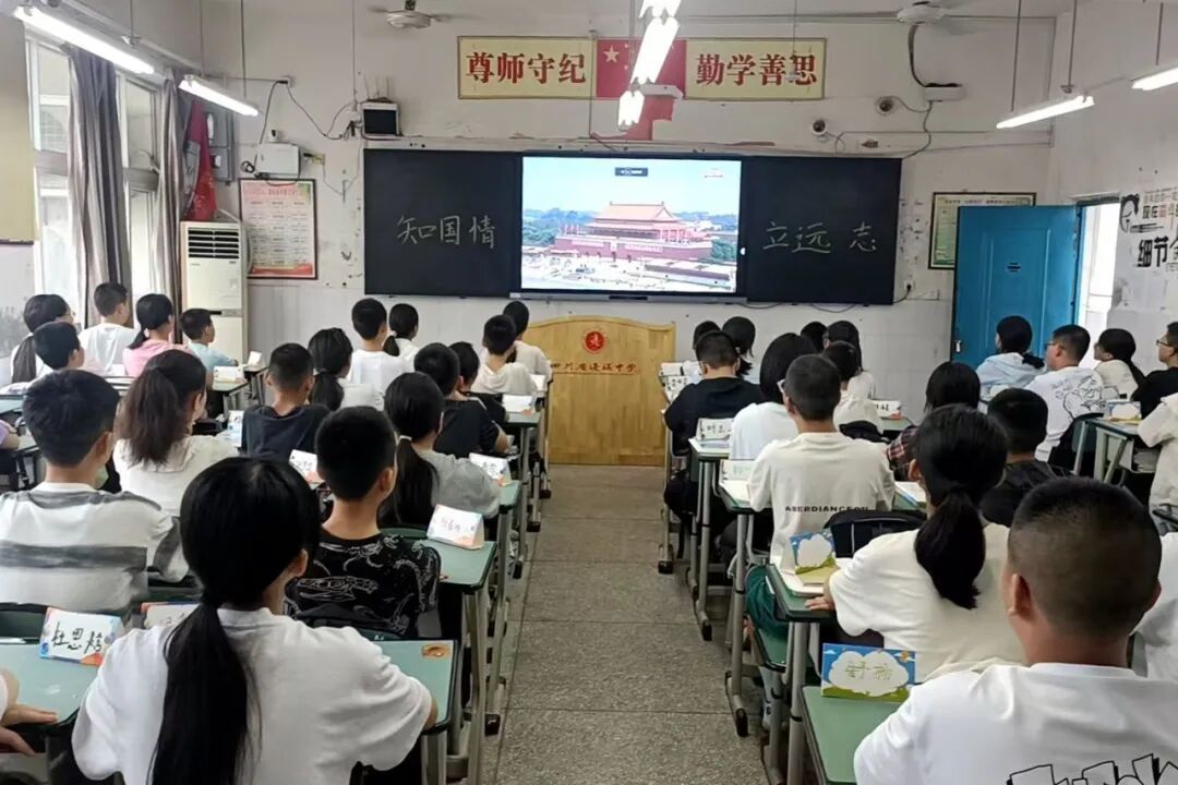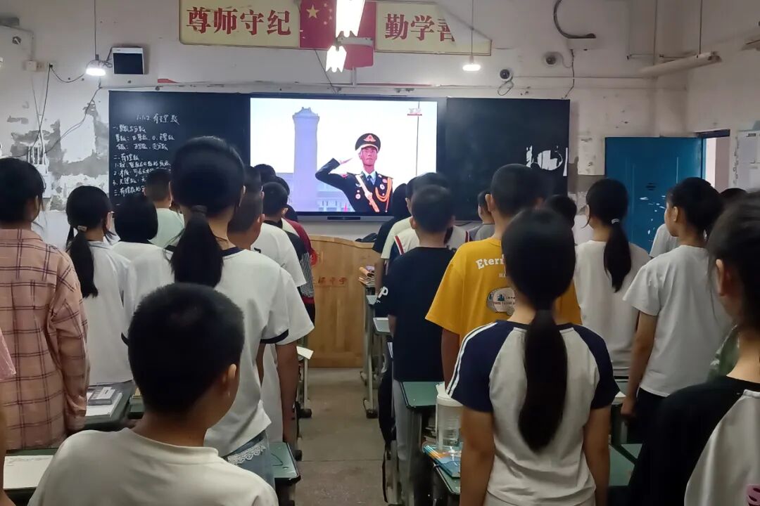 全校各班通过网络平台同步直播,班主任精心组织上好2025年秋季开学这堂触动灵魂的“爱国主题思政班会课”。当国歌声响起,全体同学自发起立,庄严注视屏幕上冉冉升起的五星红旗,嘹亮的歌声在教室内回荡。