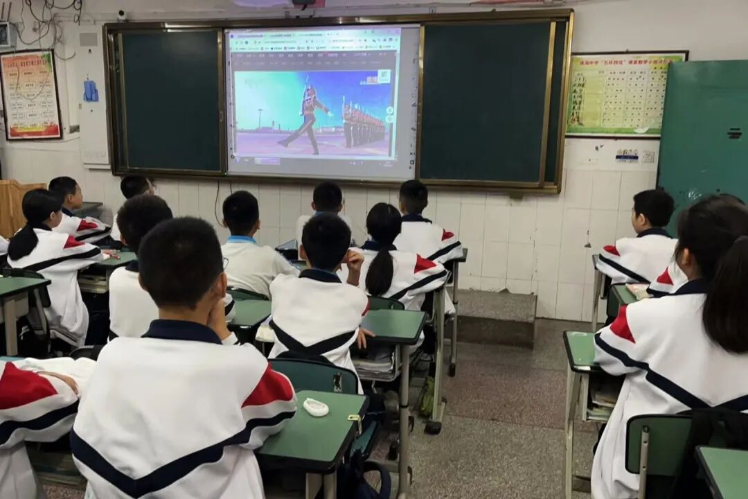阅兵式上,威武雄壮的受阅方队、彰显国家实力的现代化武器装备、翱翔蓝天的战鹰依次通过天安门广场,接受祖国和人民检阅。校园内掌声、赞叹声不断,官兵们的铿锵步伐、坚毅眼神和整齐动作,展现了人民军队的强大威武,也让师生们的民族自尊心和自豪感油然而生 。