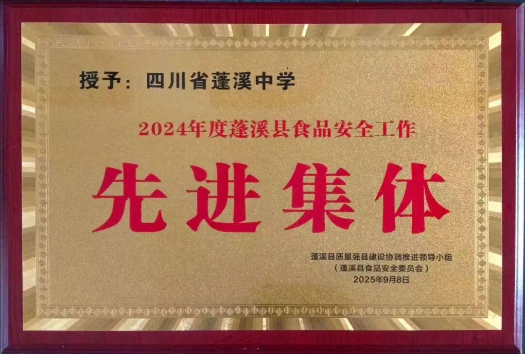 近日,蓬溪中学荣获由蓬溪县质量强县建设协调推进领导小组(蓬溪县食品安全委员会)表扬的 “2024年度蓬溪县食品安全工作先进集体” 称号。