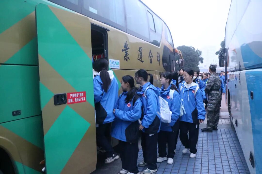 12月2日清晨,寒意未消,蓬溪中学运动场已旌旗飘扬,气氛热烈。初2025级广安研学实践活动开营仪式如期举行,学校党委副书记冯梅担任主持,介绍研学活动整体安排。学校党委书记胥杰致辞,向即将启程的师生致以殷切祝福。他强调,研学实践是课堂的延伸与成长的课堂,鼓励同学们在广安这片承载着厚重记忆的土地上,用眼发现、用心感受,汲取奋进力量、提升综合素养。学生代表郭子豪带领全体研学学子庄严宣誓,“严守研学纪律,服从老师调度”“在建川馆中铭记初心,在小平故居汲取力量”的铿锵誓言响彻运动场。研学总教官李昆强调安全须知与出行规范,为活动的顺利开展筑牢保障。